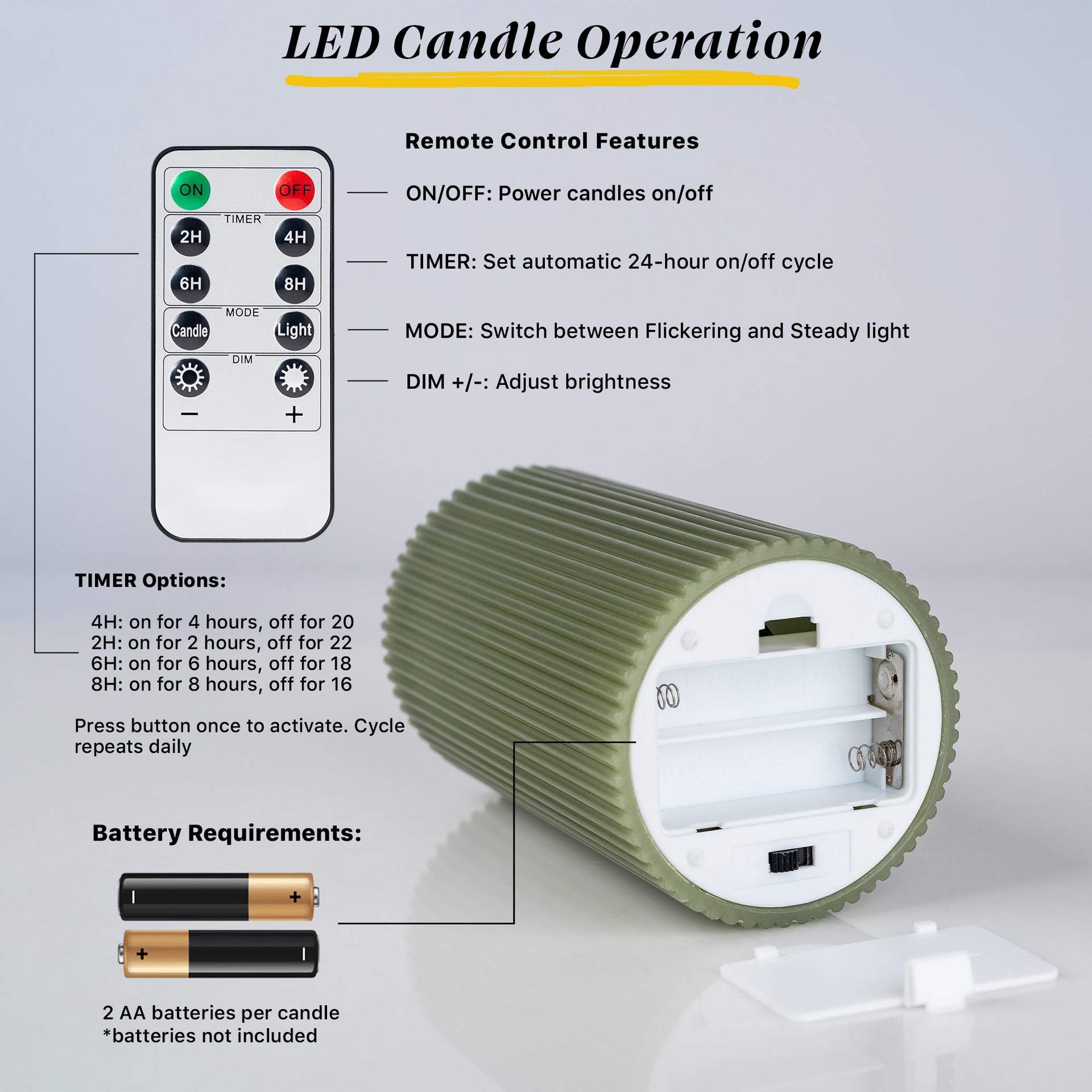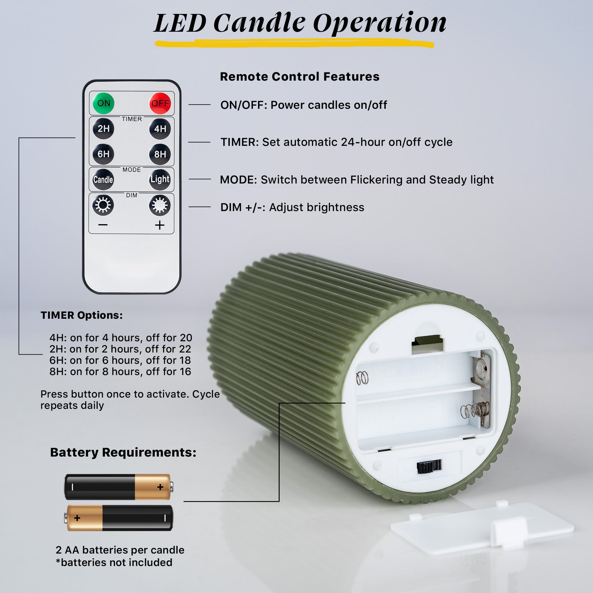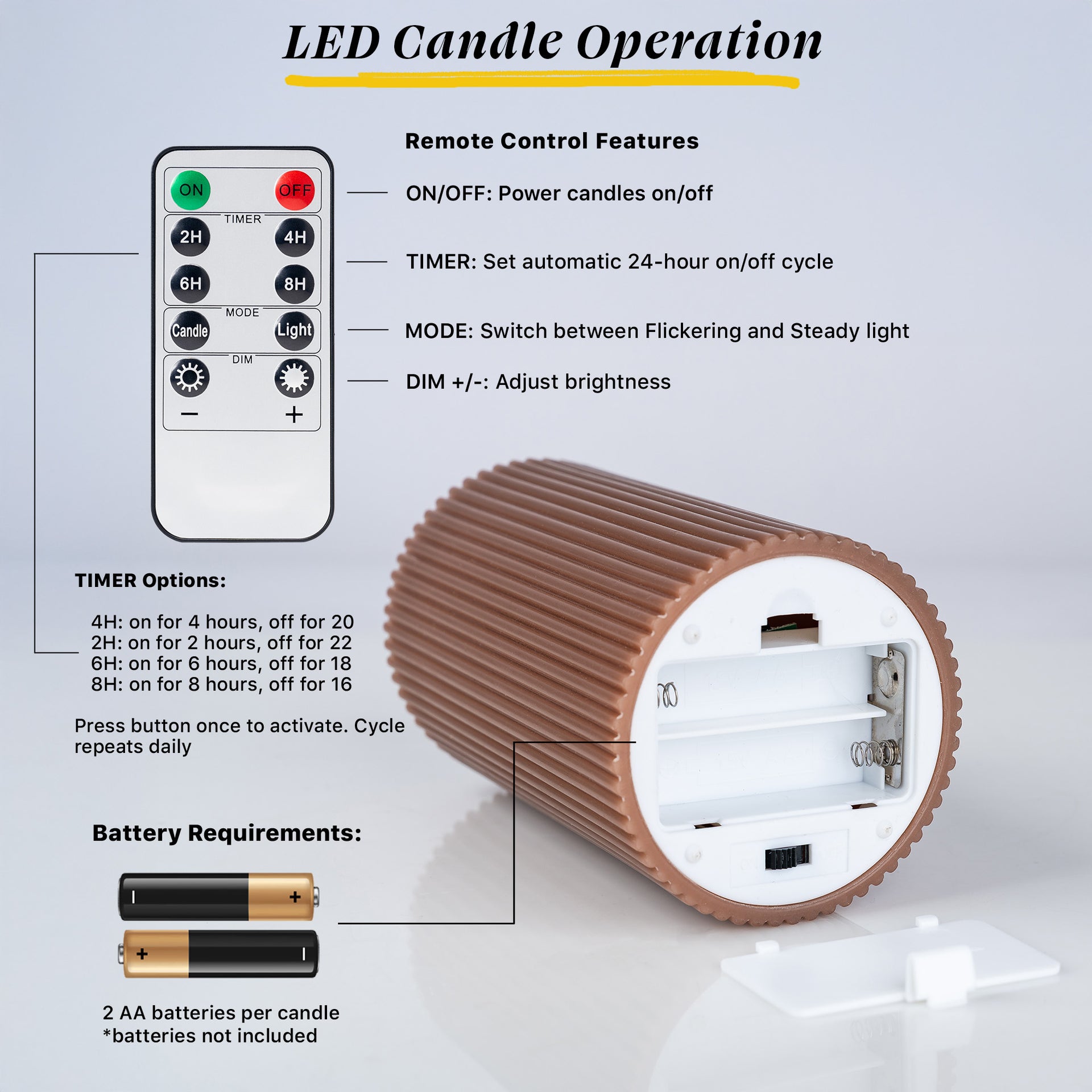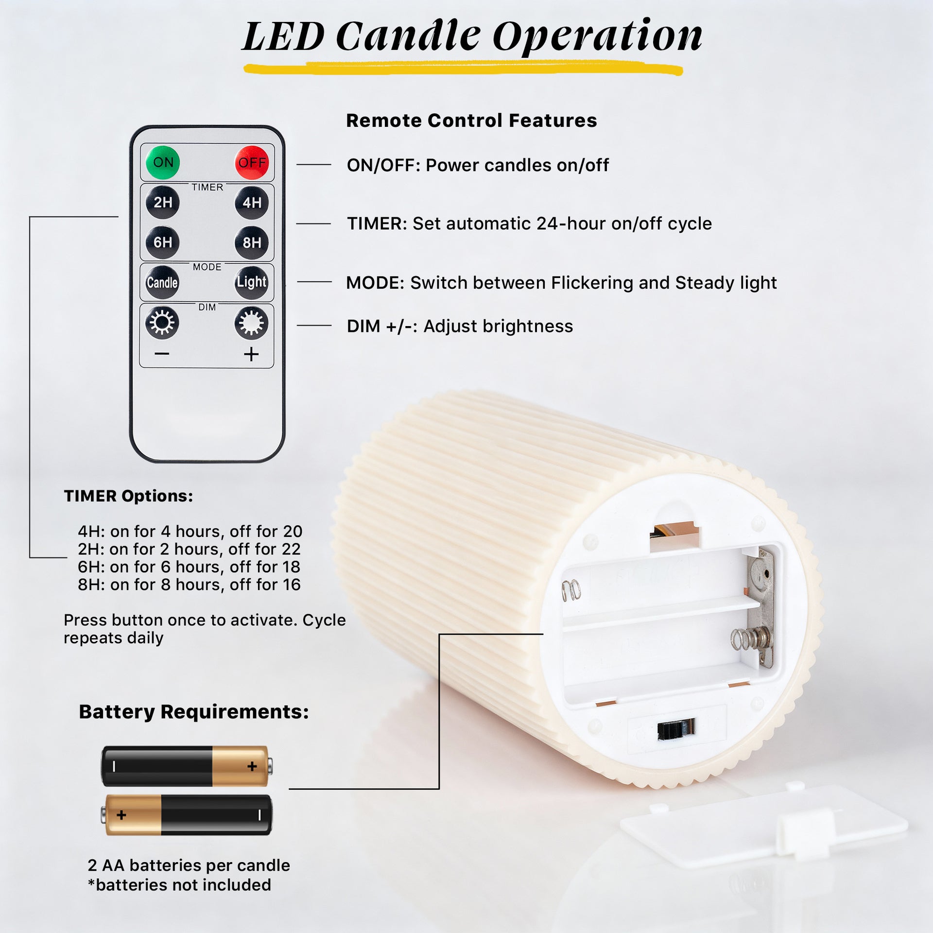 - DUAL CONTROL WITH SMART MEMORY: Experience unparalleled convenience with both remote and manual control options. The remote offers 2H/4H/6H/8H timer settings, brightness adjustment, and light modes (flicker/steady glow). A smart 24-hour cycle memory ensures your chosen timer setting repeats daily. Quickly adjust settings with the bottom on/off switch on each candle for effortless ambiance control