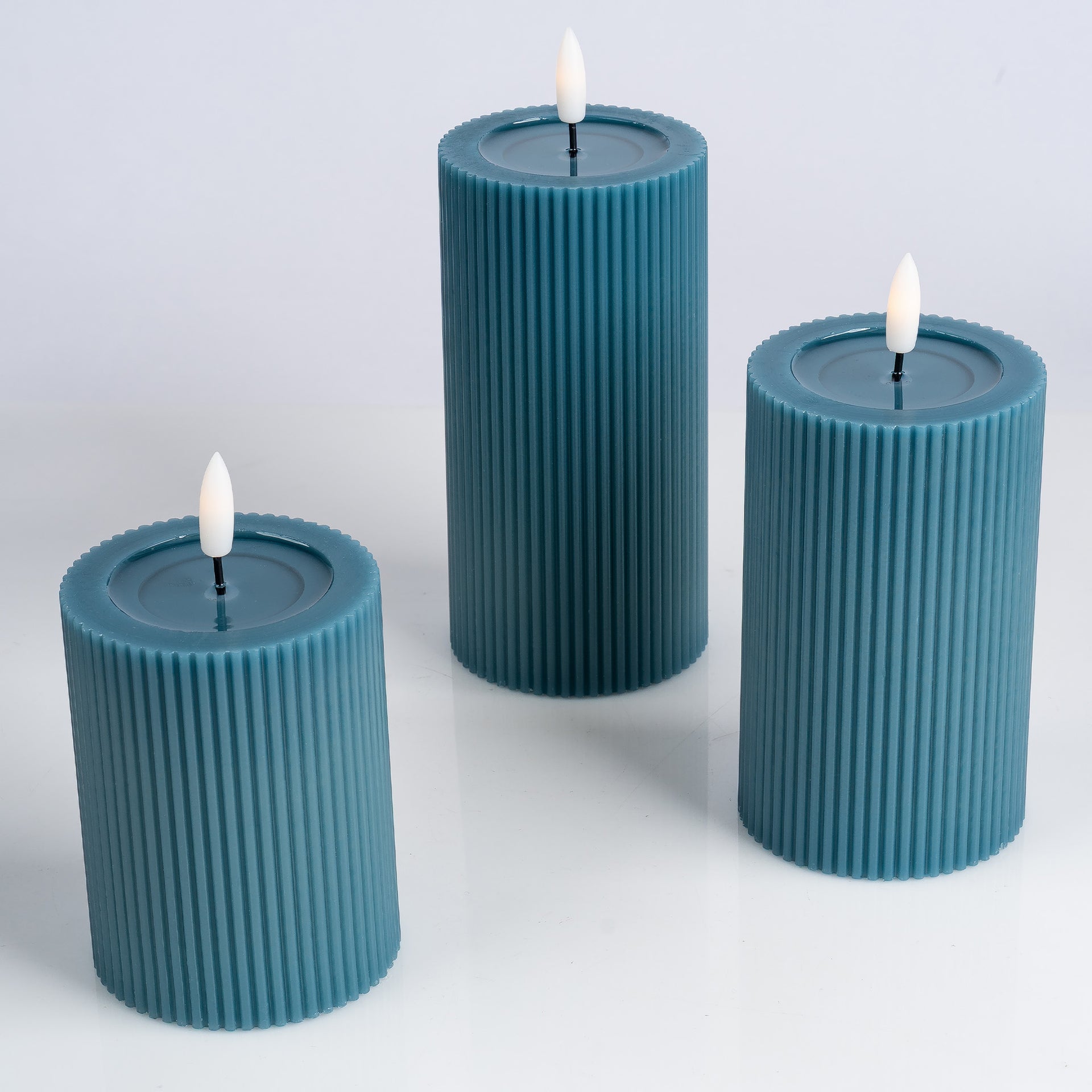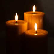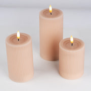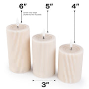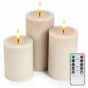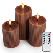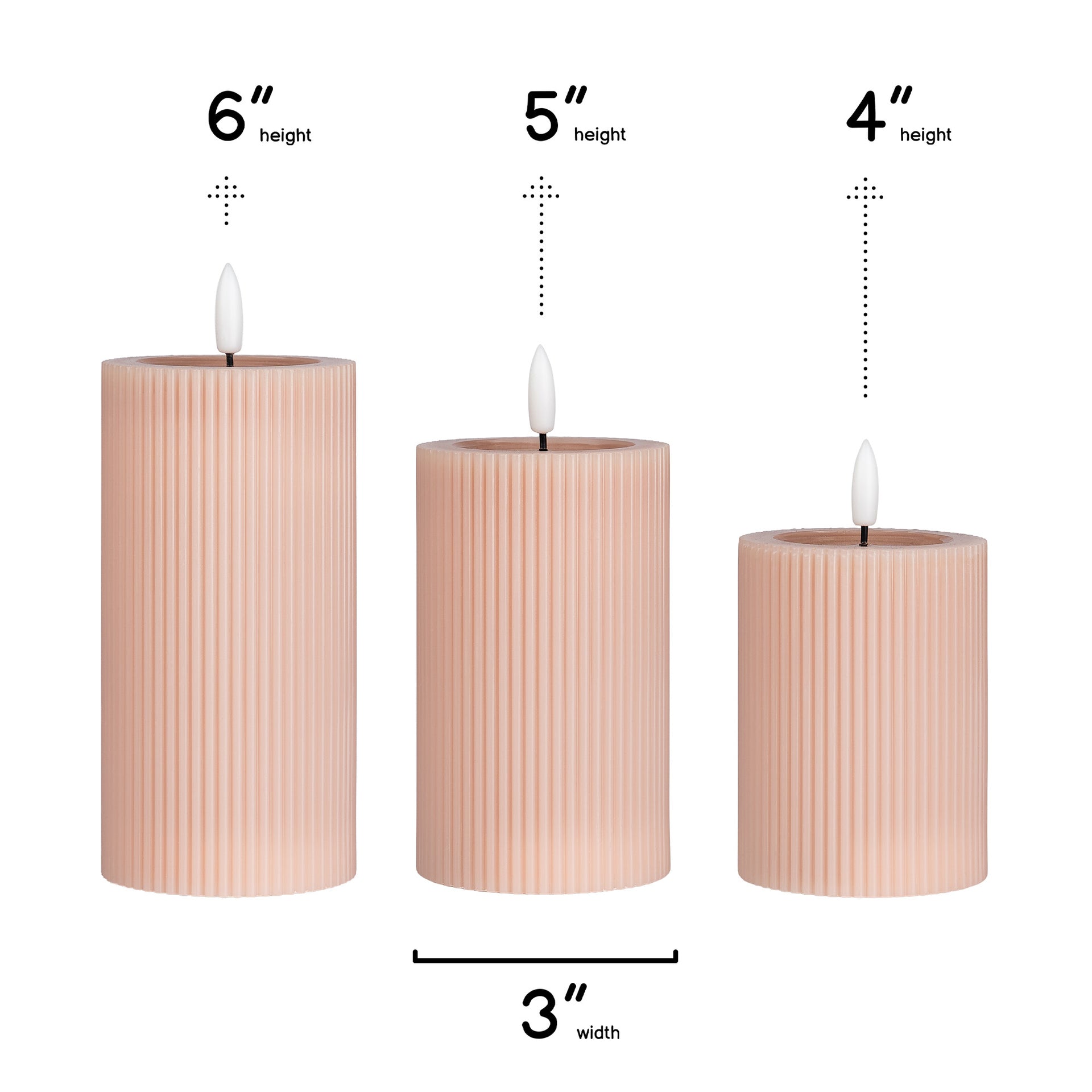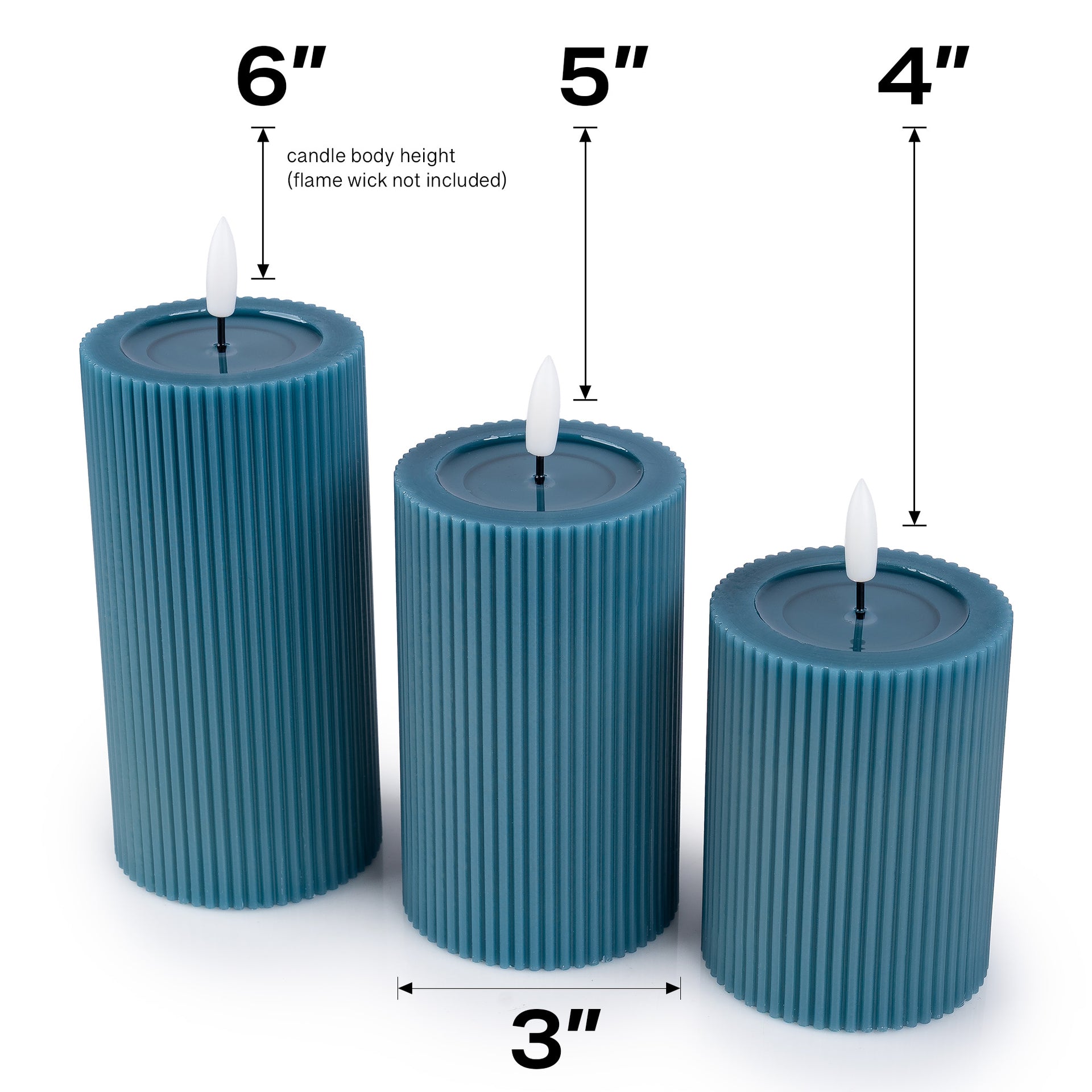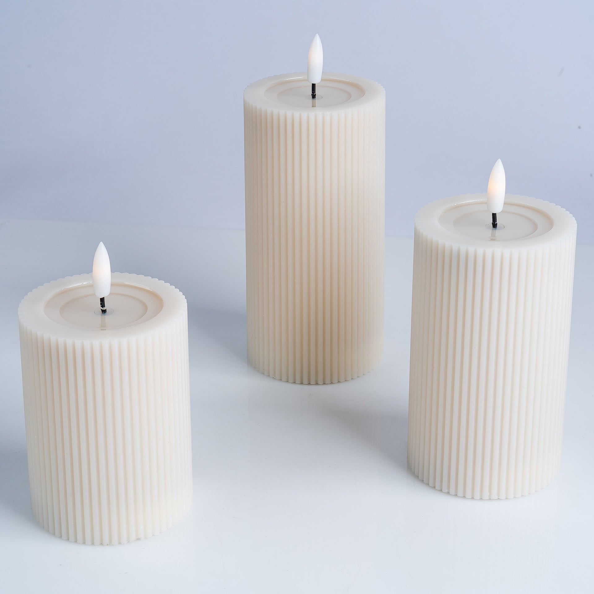 - DISTINCTIVE FLUTED DESIGN: This set of 3 grooved LED pillar candles (4”, 5”, and 6” tall, each 3” wide) features an elegant ribbed texture, evoking the charm of classic carved wax columns. These sculpted flameless candles add a touch of sophistication to any setting—without the fire risks