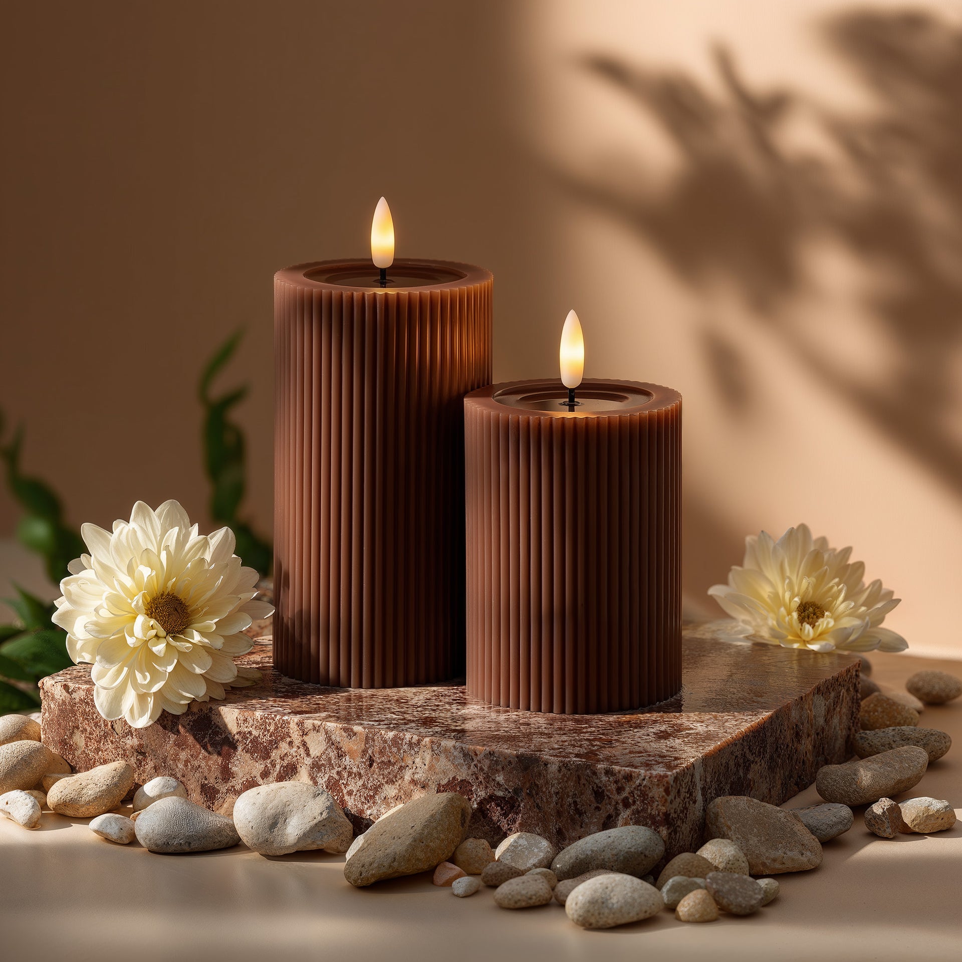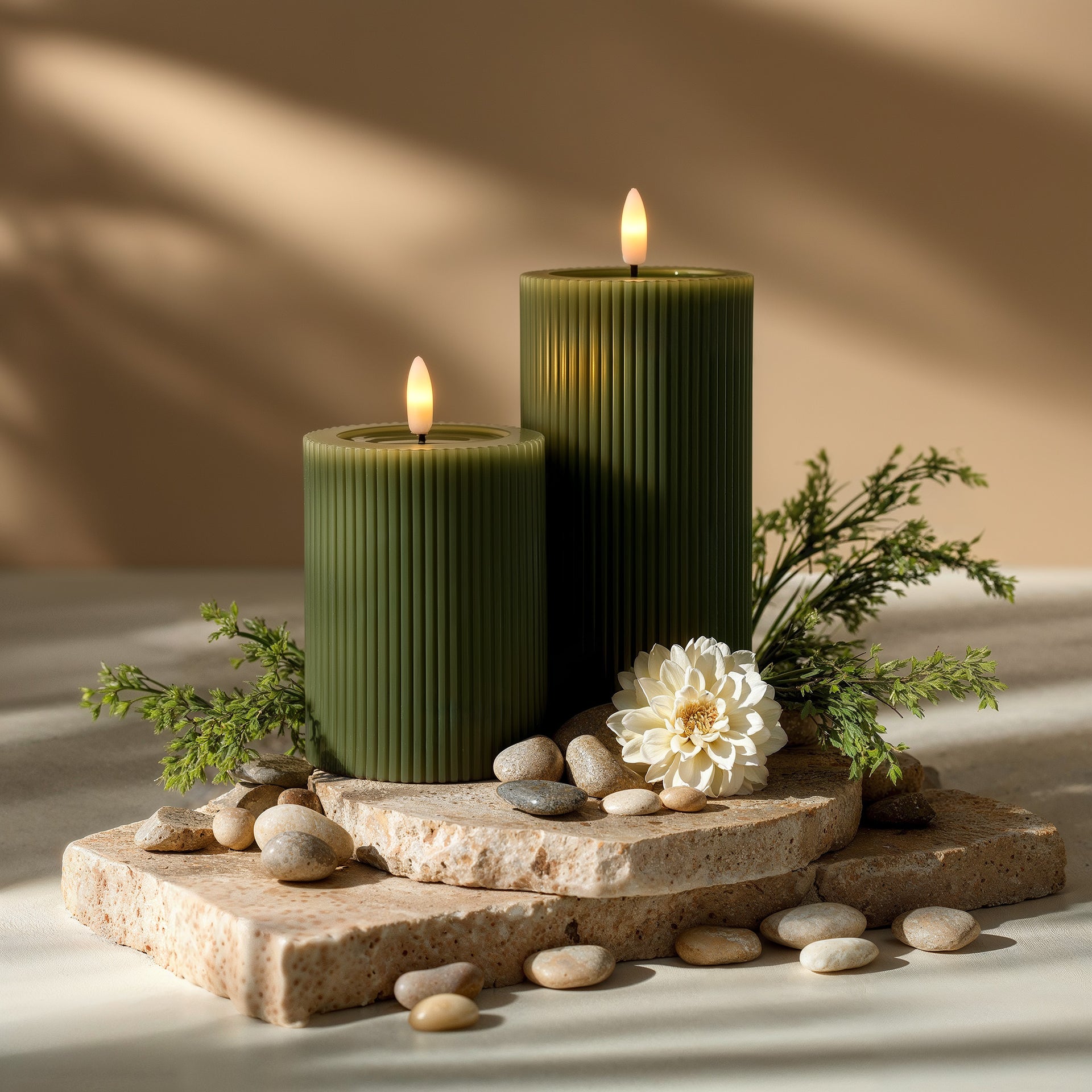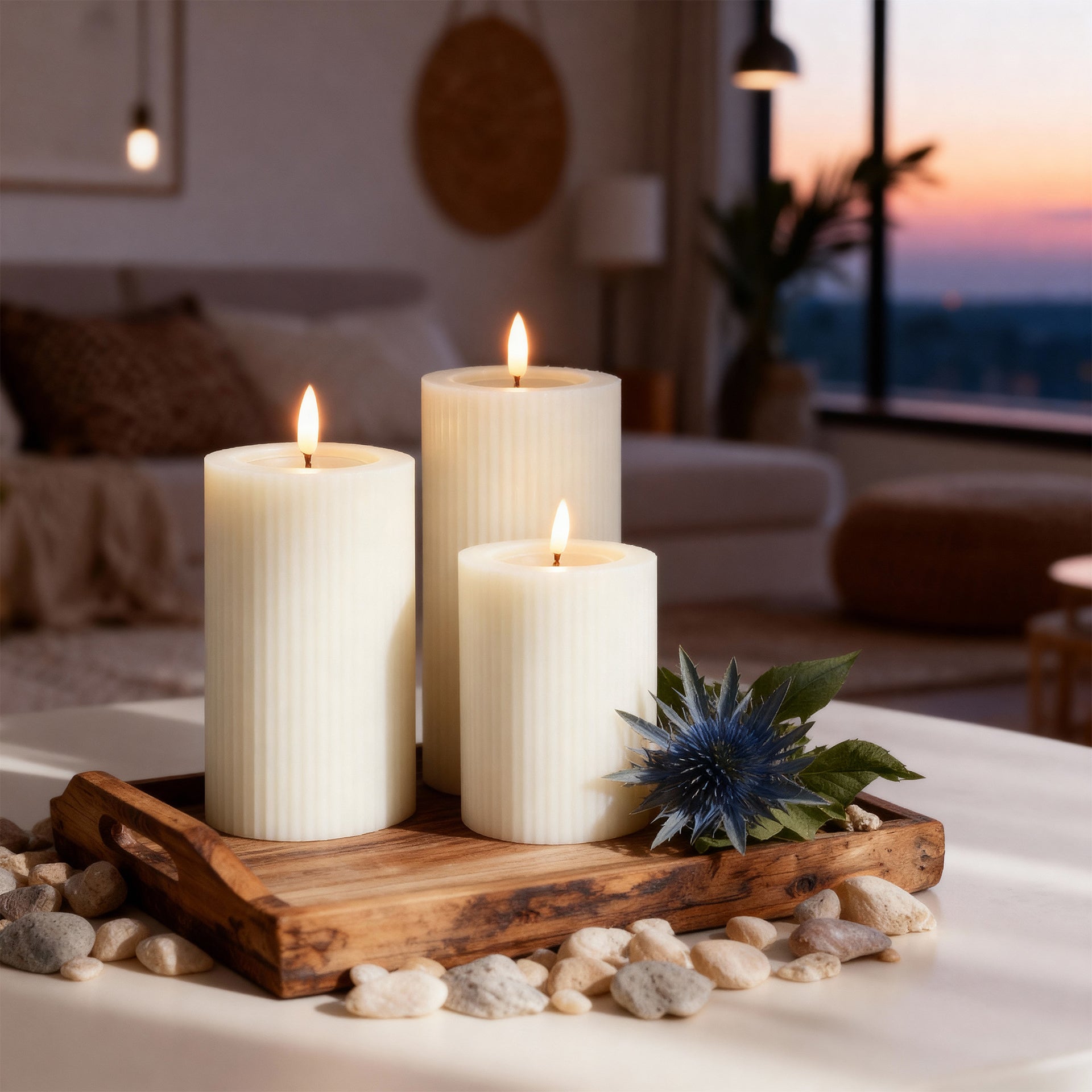 - DISTINCTIVE FLUTED DESIGN: This set of 3 grooved LED pillar candles (4”, 5”, and 6” tall, each 3” wide) features an elegant ribbed texture, evoking the charm of classic carved wax columns. These sculpted flameless candles add a touch of sophistication to any setting—without the fire risks