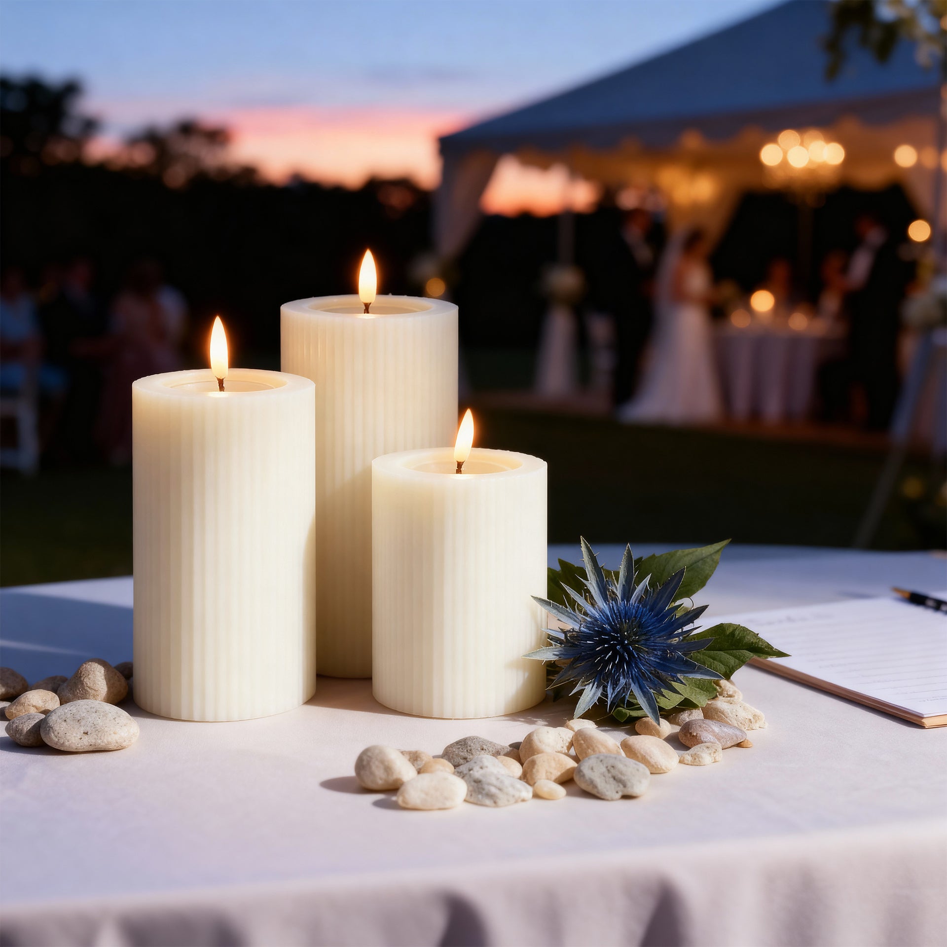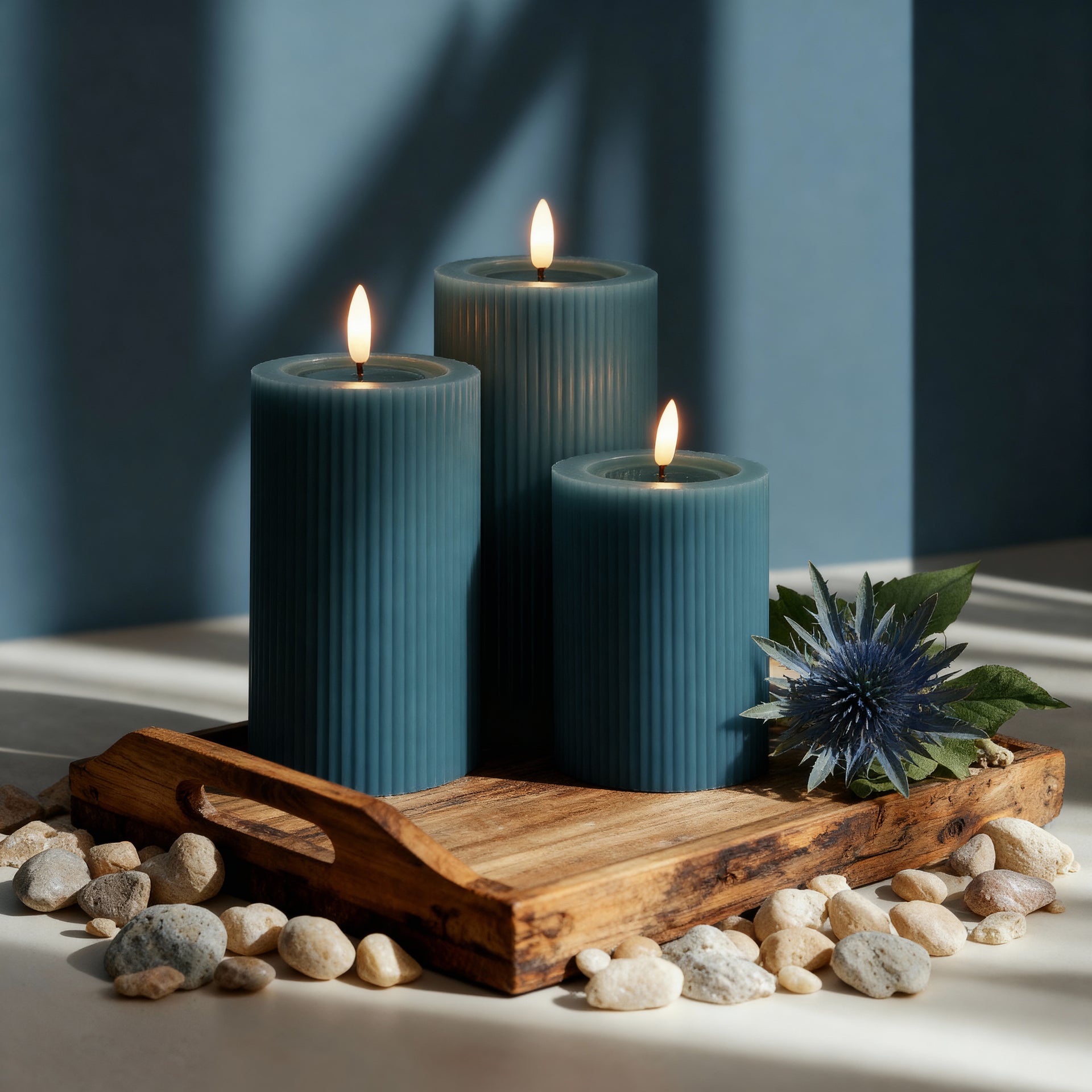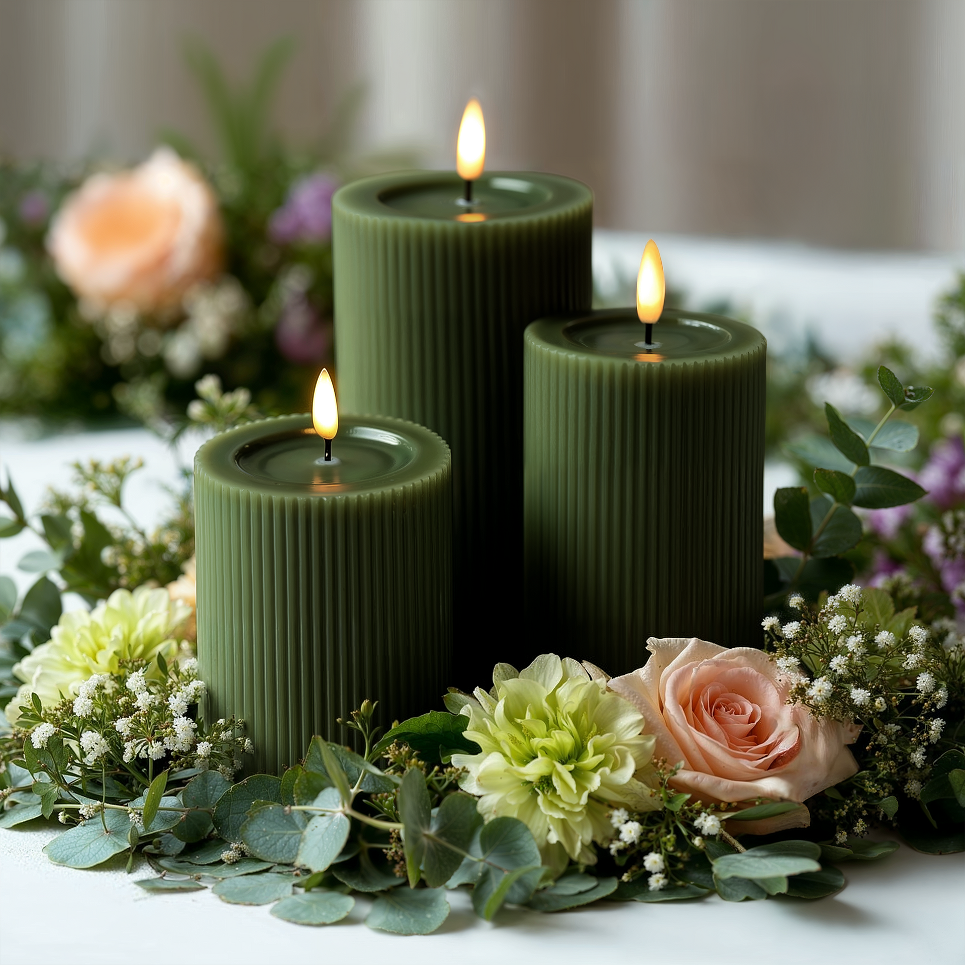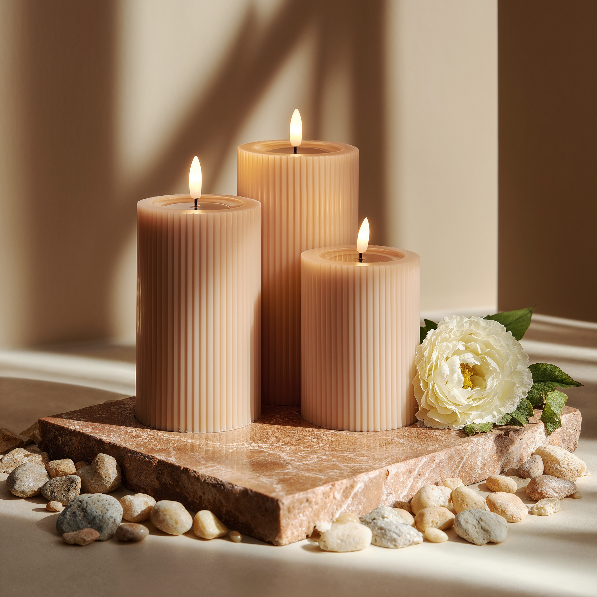 - DISTINCTIVE FLUTED DESIGN: This set of 3 grooved LED pillar candles (4”, 5”, and 6” tall, each 3” wide) features an elegant ribbed texture, evoking the charm of classic carved wax columns. These sculpted flameless candles add a touch of sophistication to any setting—without the fire risks
