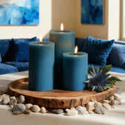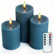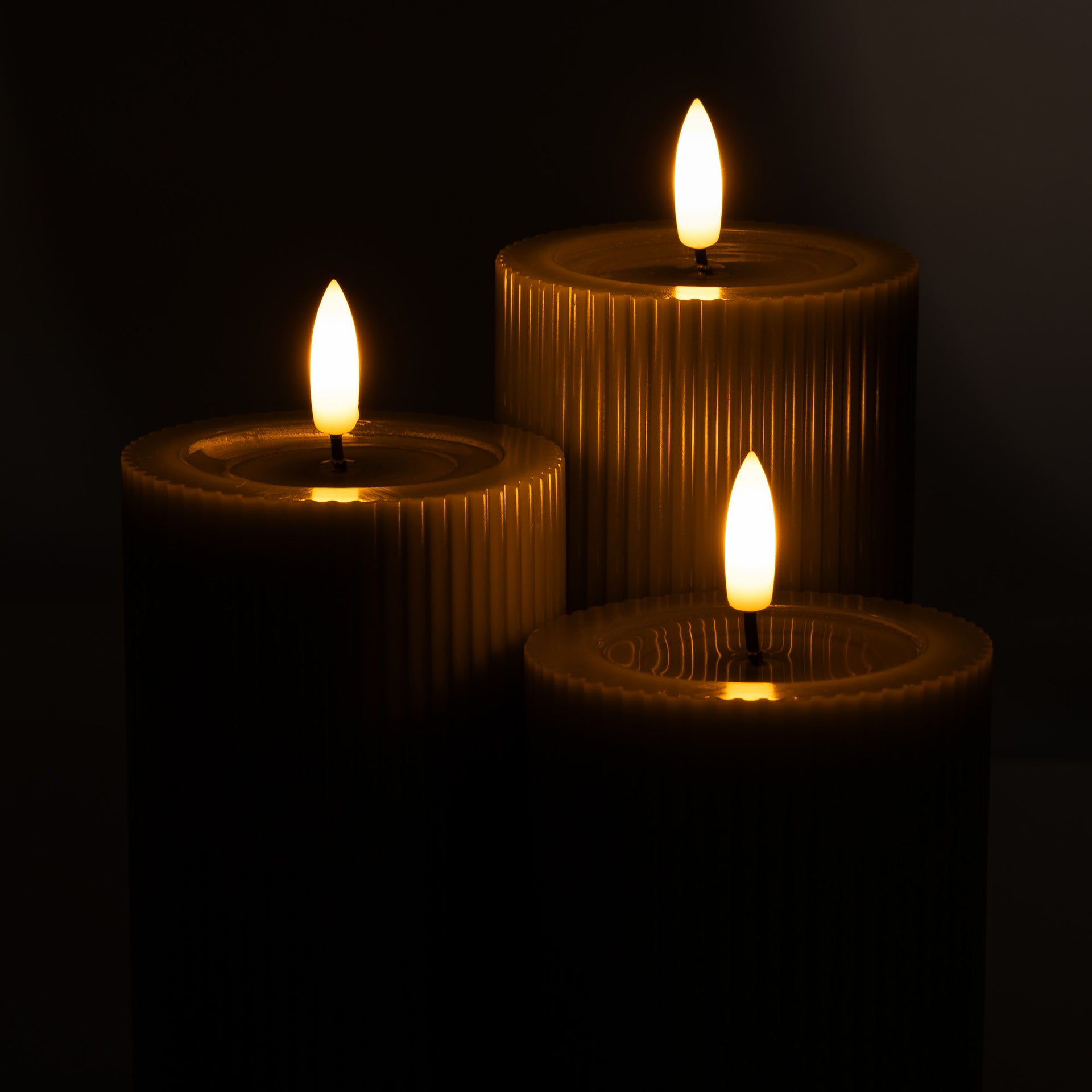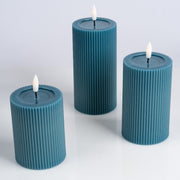 Fluted Ribbed LED Pillar Candles, with Reflective Melted-Wax Effect – Flickering Flame, Remote, Dimmable, Flameless, (Set of 3)